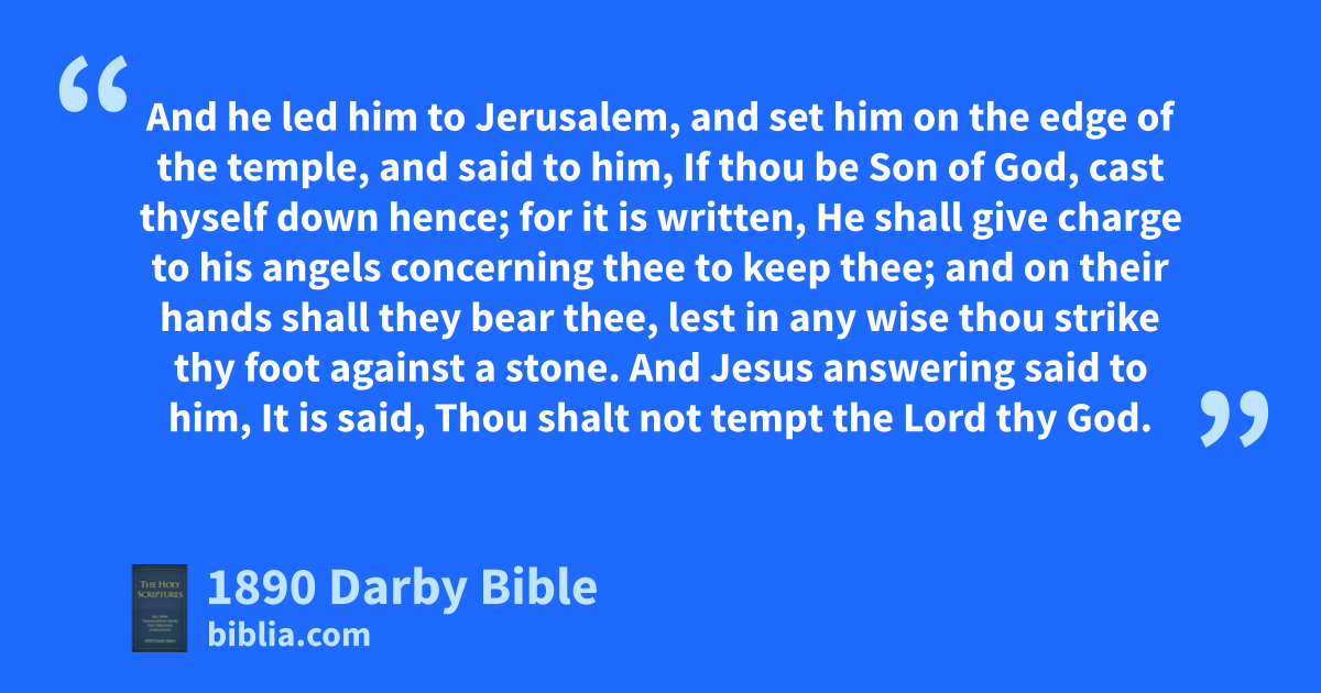 1 But Jesus, full of the Holy Spirit, returned from the Jordan, and was led by the Spirit in the wilderness 2 forty days, tempted of the devil; and in those days he did not eat anything, and when they were finished he hungered. 3 And the devil said to him, If thou be Son of God, speak to this stone, that it become bread. 4 And Jesus answered unto him saying, It is written, Man shall not live by bread alone, but by every word of God. 5 And the devil, leading him up into a high mountain, shewed him all the kingdoms of the habitable world in a moment of time. 6 And the devil said to him, I will give thee all this power, and their glory; for it is given up to me, and to whomsoever I will I give it. 7 If therefore thou wilt do homage before me, all of it shall be thine. 8 And Jesus answering him said, It is written, Thou shalt do homage to the Lord thy God, and him alone shalt thou serve. 9 And he led him to Jerusalem, and set him on the edge of the temple, and said to him, If thou be Son of God, cast thyself down hence; 10 for it is written, He shall give charge to his angels concerning thee to keep thee; 11 and on their hands shall they bear thee, lest in any wise thou strike thy foot against a stone. 12 And Jesus answering said to him, It is said, Thou shalt not tempt the Lord thy God. 13 And the devil, having completed every temptation, departed from him for a time.