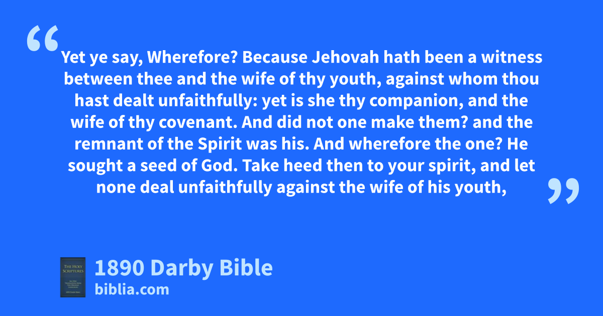 10 Have we not all one father? Hath not one •God created us? Why do we deal unfaithfully every man against his brother, by profaning the covenant of our fathers? 11 Judah hath dealt unfaithfully, and an abomination is committed in Israel and in Jerusalem; for Judah hath profaned the sanctuary of Jehovah which he loved, and hath married the daughter of a strange •god. 12 Jehovah will cut off from the tents of Jacob the man that doeth this, him that calleth and him that answereth; and him that offereth an oblation unto Jehovah of hosts. 13 And further ye do this: ye cover the altar of Jehovah with tears, with weeping, and with sighing, insomuch that he regardeth not the oblation any more, nor receiveth it with satisfaction at your hand. 14 Yet ye say, Wherefore? Because Jehovah hath been a witness between thee and the wife of thy youth, against whom thou hast dealt unfaithfully: yet is she thy companion, and the wife of thy covenant. 15 And did not one make them? and the remnant of the Spirit was his. And wherefore the one? He sought a seed of God. Take heed then to your spirit, and let none deal unfaithfully against the wife of his youth, 16 (for I hate putting away, saith Jehovah the God of Israel;) and he covereth with violence his garment, saith Jehovah of hosts: take heed then to your spirit, that ye deal not unfaithfully. 17 Ye have wearied Jehovah with your words, and ye say, Wherein have we wearied him? In that ye say, Every one that doeth evil is good in the sight of Jehovah, and he delighteth in them; or, Where is the God of judgment?