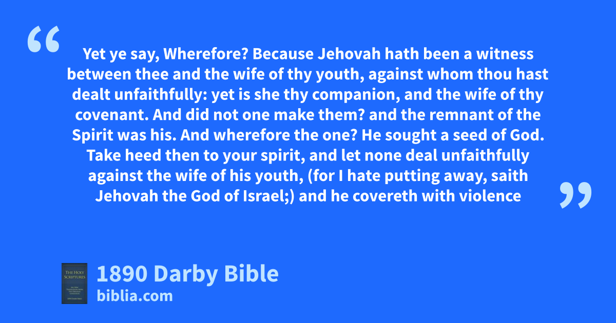 10 Have we not all one father? Hath not one •God created us? Why do we deal unfaithfully every man against his brother, by profaning the covenant of our fathers? 11 Judah hath dealt unfaithfully, and an abomination is committed in Israel and in Jerusalem; for Judah hath profaned the sanctuary of Jehovah which he loved, and hath married the daughter of a strange •god. 12 Jehovah will cut off from the tents of Jacob the man that doeth this, him that calleth and him that answereth; and him that offereth an oblation unto Jehovah of hosts. 13 And further ye do this: ye cover the altar of Jehovah with tears, with weeping, and with sighing, insomuch that he regardeth not the oblation any more, nor receiveth it with satisfaction at your hand. 14 Yet ye say, Wherefore? Because Jehovah hath been a witness between thee and the wife of thy youth, against whom thou hast dealt unfaithfully: yet is she thy companion, and the wife of thy covenant. 15 And did not one make them? and the remnant of the Spirit was his. And wherefore the one? He sought a seed of God. Take heed then to your spirit, and let none deal unfaithfully against the wife of his youth, 16 (for I hate putting away, saith Jehovah the God of Israel;) and he covereth with violence his garment, saith Jehovah of hosts: take heed then to your spirit, that ye deal not unfaithfully. 17 Ye have wearied Jehovah with your words, and ye say, Wherein have we wearied him? In that ye say, Every one that doeth evil is good in the sight of Jehovah, and he delighteth in them; or, Where is the God of judgment?
