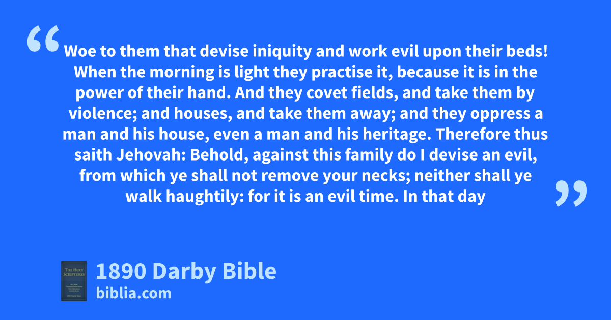 1 Woe to them that devise iniquity and work evil upon their beds! When the morning is light they practise it, because it is in the power of their hand. 2 And they covet fields, and take them by violence; and houses, and take them away; and they oppress a man and his house, even a man and his heritage. 3 Therefore thus saith Jehovah: Behold, against this family do I devise an evil, from which ye shall not remove your necks; neither shall ye walk haughtily: for it is an evil time. 4 In that day shall they take up a proverb concerning you, and lament with a doleful lamentation, and say, We are utterly spoiled: he hath changed the portion of my people: how hath he removed it from me! He hath distributed our fields to the rebellious. 5 Therefore thou shalt have none that shall cast the measuring line upon a lot, in the congregation of Jehovah.