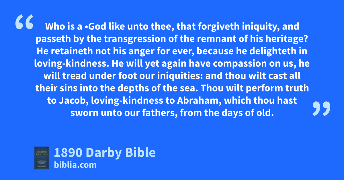 14 Feed thy people with thy rod, the flock of thine inheritance, dwelling alone in the forest, in the midst of Carmel: let them feed in Bashan and Gilead, as in the days of old. 15 —As in the days of thy coming forth out of the land of Egypt, will I shew them marvellous things. 16 —The nations shall see, and be ashamed for all their might: they shall lay their hand upon their mouth, their ears shall be deaf. 17 They shall lick dust like the serpent; like crawling things of the earth, they shall come trembling forth from their close places. They shall turn with fear to Jehovah our God, and shall be afraid because of thee. 18 Who is a •God like unto thee, that forgiveth iniquity, and passeth by the transgression of the remnant of his heritage? He retaineth not his anger for ever, because he delighteth in loving-kindness. 19 He will yet again have compassion on us, he will tread under foot our iniquities: and thou wilt cast all their sins into the depths of the sea. 20 Thou wilt perform truth to Jacob, loving-kindness to Abraham, which thou hast sworn unto our fathers, from the days of old.