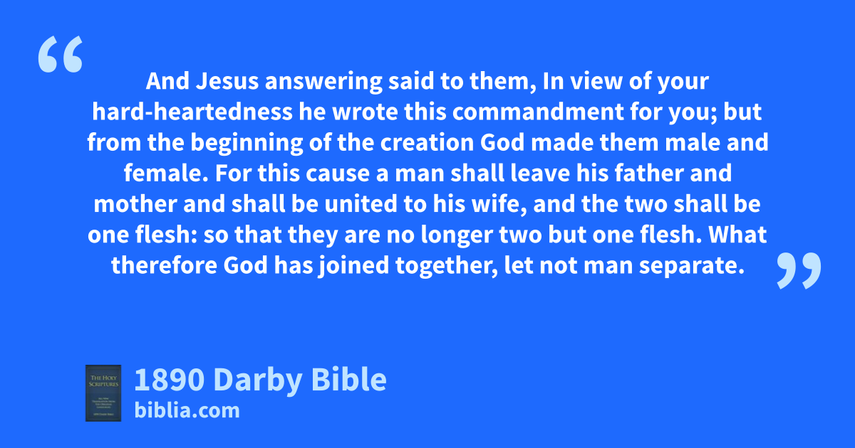 1 And rising up thence he comes into the coasts of Judaea, and the other side of the Jordan. And again crowds come together to him, and, as he was accustomed, again he taught them. 2 And Pharisees coming to him asked him, Is it lawful for a man to put away his wife? (tempting him). 3 But he answering said to them, What did Moses command you? 4 And they said, Moses allowed to write a bill of divorce, and to put away. 5 And Jesus answering said to them, In view of your hard-heartedness he wrote this commandment for you; 6 but from the beginning of the creation God made them male and female. 7 For this cause a man shall leave his father and mother and shall be united to his wife, 8 and the two shall be one flesh: so that they are no longer two but one flesh. 9 What therefore God has joined together, let not man separate. 10 And again in the house the disciples asked him concerning this. 11 And he says to them, Whosoever shall put away his wife and shall marry another, commits adultery against her. 12 And if a woman put away her husband and shall marry another, she commits adultery.