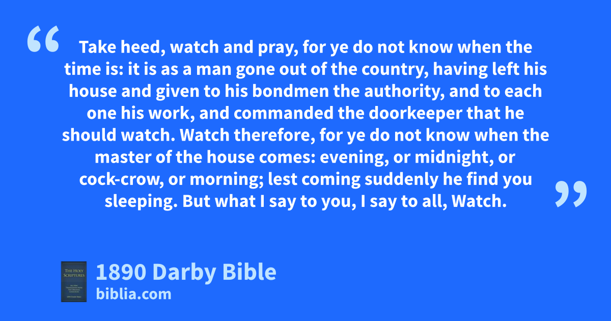 28 But learn the parable from the fig-tree: when its branch already becomes tender and puts forth the leaves, ye know that the summer is near. 29 Thus also ye, when ye see these things happening, know that it is near, at the doors. 30 Verily I say unto you, This generation shall in no wise pass away, till all these things take place. 31 The heaven and the earth shall pass away, but my words shall in no wise pass away. 32 But of that day or of that hour no one knows, neither the angels who are in heaven, nor the Son, but the Father. 33 Take heed, watch and pray, for ye do not know when the time is: 34 it is as a man gone out of the country, having left his house and given to his bondmen the authority, and to each one his work, and commanded the doorkeeper that he should watch. 35 Watch therefore, for ye do not know when the master of the house comes: evening, or midnight, or cock-crow, or morning; 36 lest coming suddenly he find you sleeping. 37 But what I say to you, I say to all, Watch.