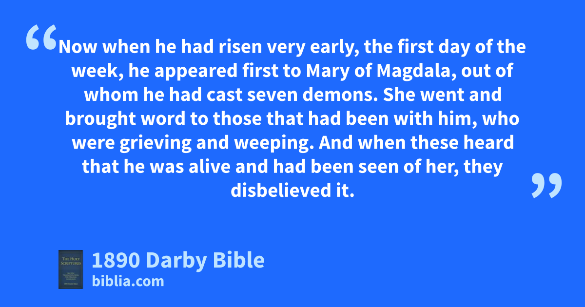 9 Now when he had risen very early, the first day of the week, he appeared first to Mary of Magdala, out of whom he had cast seven demons. 10 She went and brought word to those that had been with him, who were grieving and weeping. 11 And when these heard that he was alive and had been seen of her, they disbelieved it. 12 And after these things he was manifested in another form to two of them as they walked, going into the country; 13 and they went and brought word to the rest; neither did they believe them.