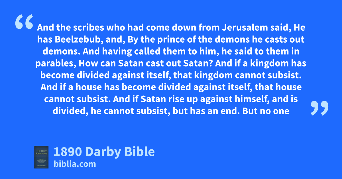 22 And the scribes who had come down from Jerusalem said, He has Beelzebub, and, By the prince of the demons he casts out demons. 23 And having called them to him, he said to them in parables, How can Satan cast out Satan? 24 And if a kingdom has become divided against itself, that kingdom cannot subsist. 25 And if a house has become divided against itself, that house cannot subsist. 26 And if Satan rise up against himself, and is divided, he cannot subsist, but has an end. 27 But no one can, having entered into his house, plunder the goods of the strong man unless he first bind the strong man, and then he will plunder his house. 28 Verily I say unto you, that all sins shall be forgiven to the sons of men, and all the injurious speeches with which they may speak injuriously; 29 but whosoever shall speak injuriously against the Holy Spirit, to eternity has no forgiveness; but lies under the guilt of an everlasting sin; 30 —because they said, He has an unclean spirit.