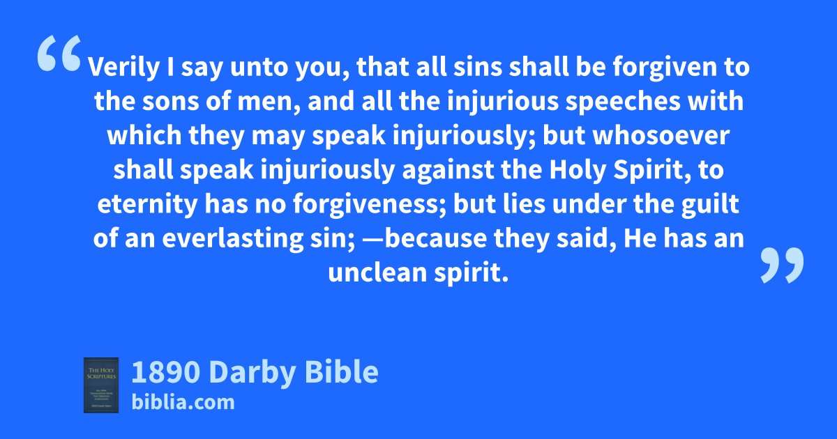 22 And the scribes who had come down from Jerusalem said, He has Beelzebub, and, By the prince of the demons he casts out demons. 23 And having called them to him, he said to them in parables, How can Satan cast out Satan? 24 And if a kingdom has become divided against itself, that kingdom cannot subsist. 25 And if a house has become divided against itself, that house cannot subsist. 26 And if Satan rise up against himself, and is divided, he cannot subsist, but has an end. 27 But no one can, having entered into his house, plunder the goods of the strong man unless he first bind the strong man, and then he will plunder his house. 28 Verily I say unto you, that all sins shall be forgiven to the sons of men, and all the injurious speeches with which they may speak injuriously; 29 but whosoever shall speak injuriously against the Holy Spirit, to eternity has no forgiveness; but lies under the guilt of an everlasting sin; 30 —because they said, He has an unclean spirit.