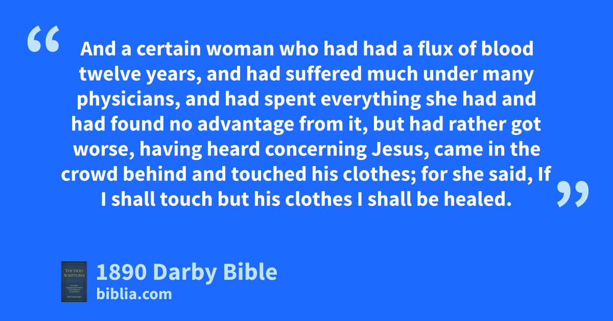 21 And Jesus having passed over in the ship again to the other side, a great crowd gathered to him; and he was by the sea. 22 And behold there comes one of the rulers of the synagogue, by name Jairus, and seeing him, falls down at his feet; 23 and he besought him much, saying, My little daughter is at extremity; I pray that thou shouldest come and lay thy hands upon her so that she may be healed, and may live. 24 And he went with him, and a large crowd followed him and pressed on him. 25 And a certain woman who had had a flux of blood twelve years, 26 and had suffered much under many physicians, and had spent everything she had and had found no advantage from it, but had rather got worse, 27 having heard concerning Jesus, came in the crowd behind and touched his clothes; 28 for she said, If I shall touch but his clothes I shall be healed. 29 And immediately her fountain of blood was dried up, and she knew in her body that she was cured from the scourge. 30 And immediately Jesus, knowing in himself the power that had gone out of him, turning round in the crowd said, Who has touched my clothes? 31 And his disciples said to him, Thou seest the crowd pressing on thee, and sayest thou, Who touched me? 32 And he looked round about to see her who had done this. 33 But the woman, frightened and trembling, knowing what had taken place in her, came and fell down before him, and told him all the truth. 34 And he said to her, Daughter, thy faith has healed thee; go in peace, and be well of thy scourge.