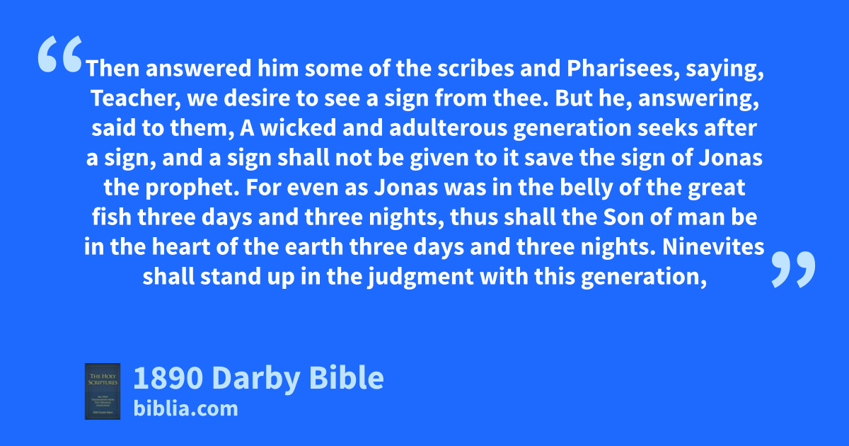 38 Then answered him some of the scribes and Pharisees, saying, Teacher, we desire to see a sign from thee. 39 But he, answering, said to them, A wicked and adulterous generation seeks after a sign, and a sign shall not be given to it save the sign of Jonas the prophet. 40 For even as Jonas was in the belly of the great fish three days and three nights, thus shall the Son of man be in the heart of the earth three days and three nights. 41 Ninevites shall stand up in the judgment with this generation, and shall condemn it: for they repented at the preaching of Jonas; and behold, more than Jonas is here. 42 A queen of the south shall rise up in the judgment with this generation, and shall condemn it; for she came from the ends of the earth to hear the wisdom of Solomon; and behold, more than Solomon is here. 43 But when the unclean spirit has gone out of the man, he goes through dry places, seeking rest, and does not find it. 44 Then he says, I will return to my house whence I came out; and having come, he finds it unoccupied, swept, and adorned. 45 Then he goes and takes with himself seven other spirits worse than himself, and entering in, they dwell there; and the last condition of that man becomes worse than the first. Thus shall it be to this wicked generation also.