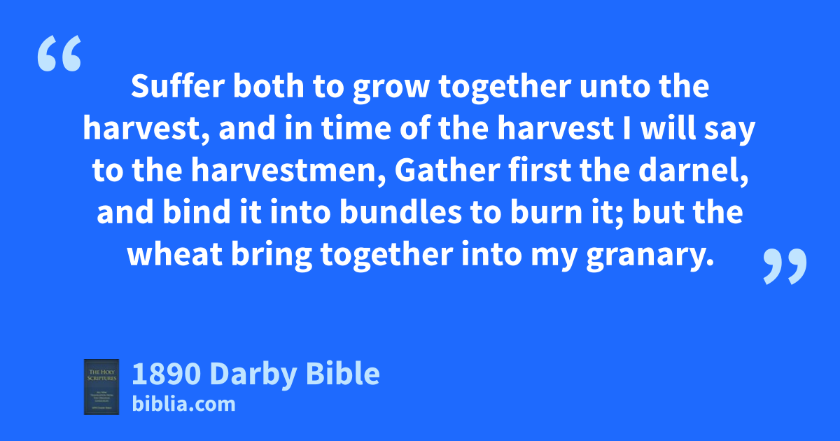 24 Another parable set he before them, saying, The kingdom of the heavens has become like a man sowing good seed in his field; 25 but while men slept, his enemy came and sowed darnel amongst the wheat, and went away. 26 But when the blade shot up and produced fruit, then appeared the darnel also. 27 And the bondmen of the householder came up and said to him, Sir, hast thou not sown good seed in thy field? whence then has it darnel? 28 And he said to them, A man that is an enemy has done this. And the bondmen said to him, Wilt thou then that we should go and gather it up? 29 But he said, No; lest in gathering the darnel ye should root up the wheat with it. 30 Suffer both to grow together unto the harvest, and in time of the harvest I will say to the harvestmen, Gather first the darnel, and bind it into bundles to burn it; but the wheat bring together into my granary. 31 Another parable set he before them, saying, The kingdom of the heavens is like a grain of mustard seed which a man took and sowed in his field; 32 which is less indeed than all seeds, but when it is grown is greater than herbs, and becomes a tree, so that the birds of heaven come and roost in its branches. 33 He spoke another parable to them: The kingdom of the heavens is like leaven, which a woman took and hid in three measures of meal until it had been all leavened. 34 All these things Jesus spoke to the crowds in parables, and without a parable he did not speak to them, 35 so that that should be fulfilled which was spoken through the prophet, saying, I will open my mouth in parables; I will utter things hidden from the world’s foundation. 36 Then, having dismissed the crowds, he went into the house; and his disciples came to him, saying, Expound to us the parable of the darnel of the field. 37 But he answering said, He that sows the good seed is the Son of man, 38 and the field is the world; and the good seed, these are the sons of the kingdom, but the darnel are the sons of the evil one; 39 and the enemy who has sowed it is the devil; and the harvest is the completion of the age, and the harvestmen are angels. 40 As then the darnel is gathered and is burned in the fire, thus it shall be in the completion of the age. 41 The Son of man shall send his angels, and they shall gather out of his kingdom all offences, and those that practise lawlessness; 42 and they shall cast them into the furnace of fire; there shall be the weeping and the gnashing of teeth. 43 Then the righteous shall shine forth as the sun in the kingdom of their Father. He that has ears, let him hear.