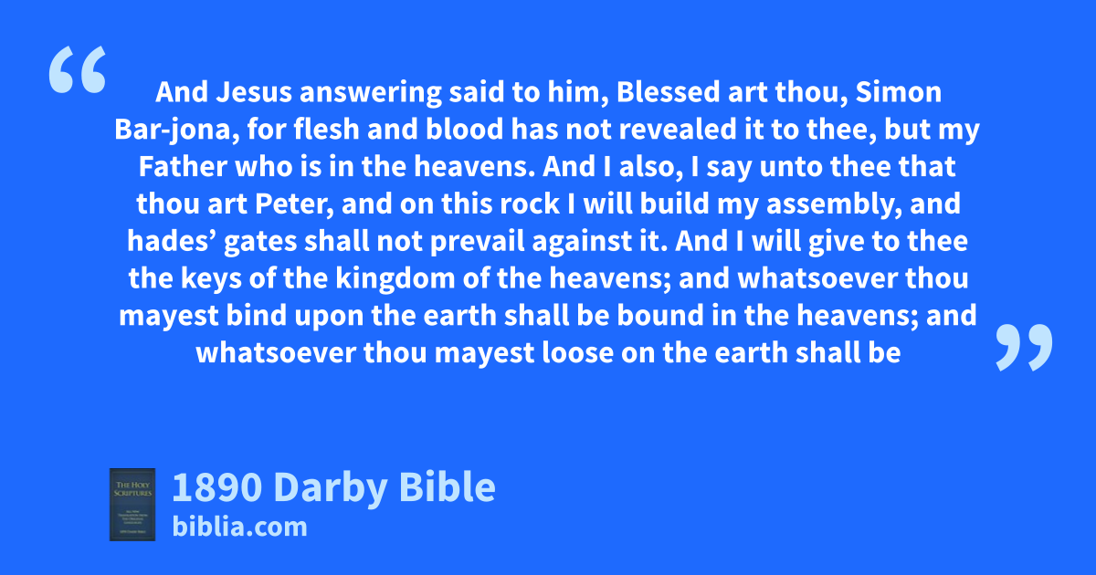 13 But when Jesus was come into the parts of Caesarea-Philippi, he demanded of his disciples, saying, Who do men say that I the Son of man am? 14 And they said, Some, John the baptist; and others, Elias; and others again, Jeremias or one of the prophets. 15 He says to them, But ye, who do ye say that I am? 16 And Simon Peter answering said, Thou art the Christ, the Son of the living God. 17 And Jesus answering said to him, Blessed art thou, Simon Bar-jona, for flesh and blood has not revealed it to thee, but my Father who is in the heavens. 18 And I also, I say unto thee that thou art Peter, and on this rock I will build my assembly, and hades’ gates shall not prevail against it. 19 And I will give to thee the keys of the kingdom of the heavens; and whatsoever thou mayest bind upon the earth shall be bound in the heavens; and whatsoever thou mayest loose on the earth shall be loosed in the heavens. 20 Then he enjoined on his disciples that they should say to no man that he was the Christ.