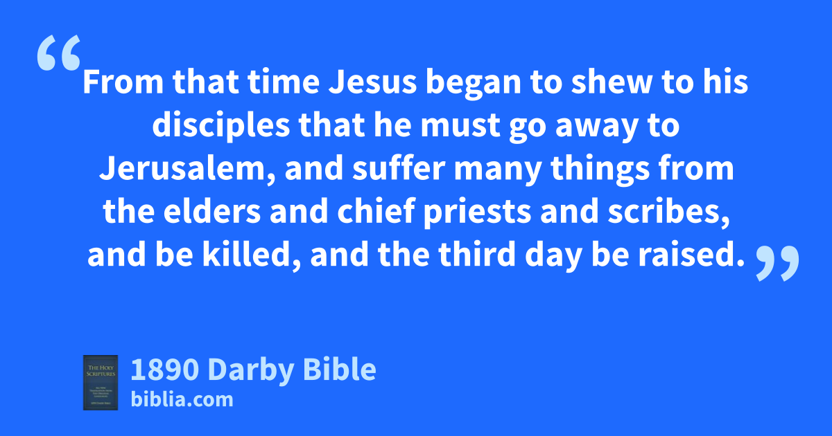 21 From that time Jesus began to shew to his disciples that he must go away to Jerusalem, and suffer many things from the elders and chief priests and scribes, and be killed, and the third day be raised. 22 And Peter taking him to him began to rebuke him, saying, God be favourable to thee, Lord; this shall in no wise be unto thee. 23 But turning round, he said to Peter, Get away behind me, Satan; thou art an offence to me, for thy mind is not on the things that are of God, but on the things that are of men.