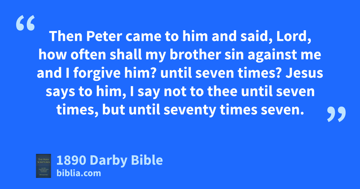 21 Then Peter came to him and said, Lord, how often shall my brother sin against me and I forgive him? until seven times? 22 Jesus says to him, I say not to thee until seven times, but until seventy times seven. 23 For this cause the kingdom of the heavens has become like a king who would reckon with his bondmen. 24 And having begun to reckon, one debtor of ten thousand talents was brought to him. 25 But he not having anything to pay, his lord commanded him to be sold, and his wife, and his children, and everything that he had, and that payment should be made. 26 The bondman therefore falling down did him homage, saying, Lord, have patience with me and I will pay thee all. 27 And the lord of that bondman, being moved with compassion, loosed him and forgave him the loan. 28 But that bondman having gone out, found one of his fellow-bondmen who owed him a hundred denarii. And having seized him, he throttled him, saying, Pay me if thou owest anything. 29 His fellow-bondman therefore, having fallen down at his feet, besought him, saying, Have patience with me, and I will pay thee. 30 But he would not, but went away and cast him into prison, until he should pay what was owing. 31 But his fellow-bondmen, having seen what had taken place, were greatly grieved, and went and recounted to their lord all that had taken place. 32 Then his lord, having called him to him, says to him, Wicked bondman! I forgave thee all that debt because thou besoughtest me; 33 shouldest not thou also have had compassion on thy fellow-bondman, as I also had compassion on thee? 34 And his lord being angry delivered him to the tormentors till he paid all that was owing to him. 35 Thus also my heavenly Father shall do to you if ye forgive not from your hearts every one his brother.