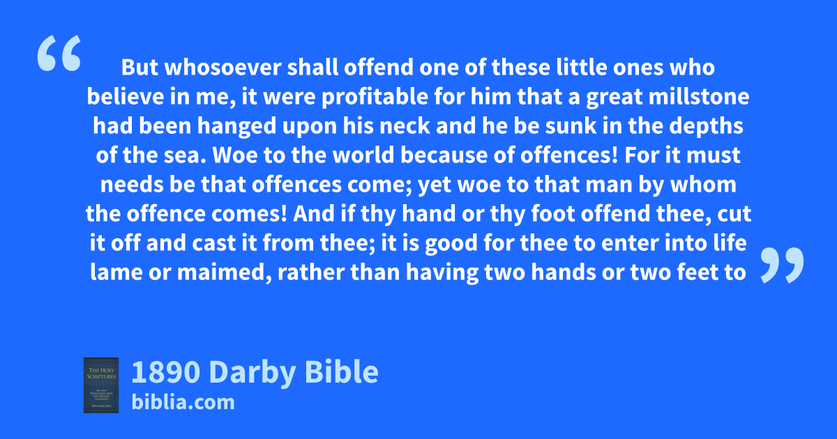 7 Woe to the world because of offences! For it must needs be that offences come; yet woe to that man by whom the offence comes! 8 And if thy hand or thy foot offend thee, cut it off and cast it from thee; it is good for thee to enter into life lame or maimed, rather than having two hands or two feet to be cast into eternal fire. 9 And if thine eye offend thee, pluck it out and cast it from thee; it is good for thee to enter into life one-eyed, rather than having two eyes to be cast into the hell of fire. 10 See that ye do not despise one of these little ones; for I say unto you that their angels in the heavens continually behold the face of my Father who is in the heavens. 11 For the Son of man has come to save that which was lost. 12 What think ye? If a certain man should have a hundred sheep, and one of them be gone astray, does he not, leaving the ninety and nine on the mountains, go and seek the one that has gone astray? 13 And if it should come to pass that he find it, verily I say unto you, he rejoices more because of it than because of the ninety and nine not gone astray. 14 So it is not the will of your Father who is in the heavens that one of these little ones should perish.