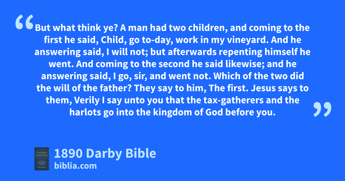 28 But what think ye? A man had two children, and coming to the first he said, Child, go to-day, work in my vineyard. 29 And he answering said, I will not; but afterwards repenting himself he went. 30 And coming to the second he said likewise; and he answering said, I go, sir, and went not. 31 Which of the two did the will of the father? They say to him, The first. Jesus says to them, Verily I say unto you that the tax-gatherers and the harlots go into the kingdom of God before you. 32 For John came to you in the way of righteousness, and ye believed him not; but the tax-gatherers and the harlots believed him; but ye when ye saw it repented not yourselves afterwards to believe him.