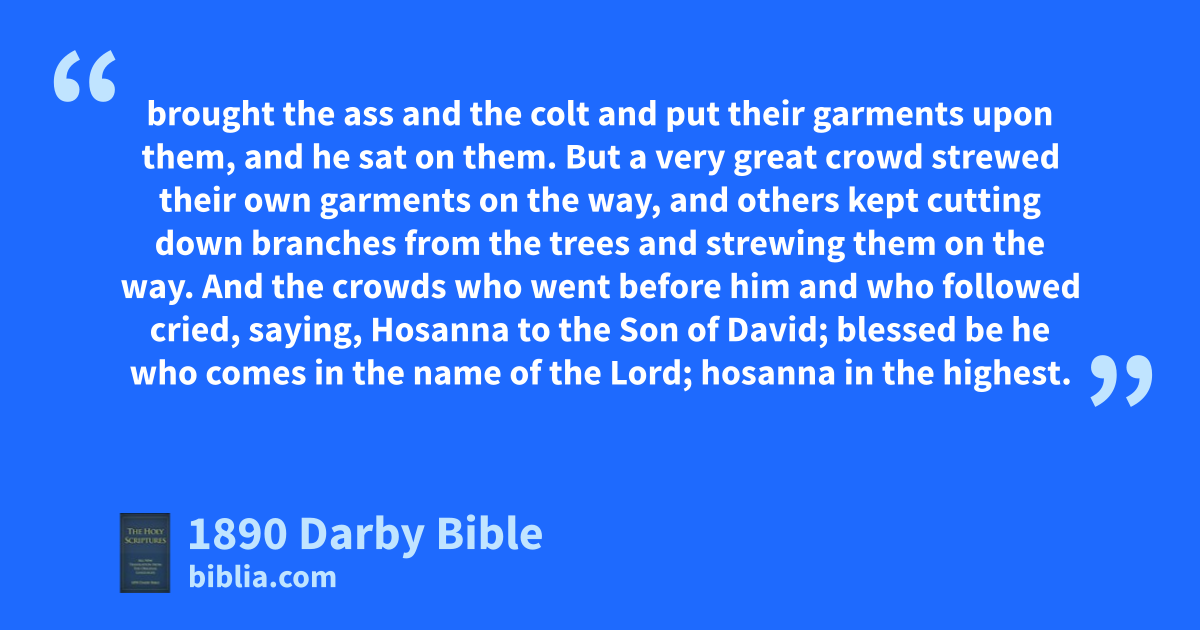 1 And when they drew near to Jerusalem and came to Bethphage, at the mount of Olives, then Jesus sent two disciples, 2 saying to them, Go into the village over against you, and immediately ye will find an ass tied, and a colt with it; loose them and lead them to me. 3 And if any one say anything to you, ye shall say, The Lord has need of them, and straightway he will send them. 4 But all this came to pass, that that might be fulfilled which was spoken through the prophet, saying, 5 Say to the daughter of Zion, Behold thy King cometh to thee, meek, and mounted upon an ass, and upon a colt the foal of an ass. 6 But the disciples, having gone and done as Jesus had ordered them, 7 brought the ass and the colt and put their garments upon them, and he sat on them. 8 But a very great crowd strewed their own garments on the way, and others kept cutting down branches from the trees and strewing them on the way. 9 And the crowds who went before him and who followed cried, saying, Hosanna to the Son of David; blessed be he who comes in the name of the Lord; hosanna in the highest. 10 And as he entered into Jerusalem, the whole city was moved, saying, Who is this? 11 And the crowds said, This is Jesus the prophet who is from Nazareth of Galilee.