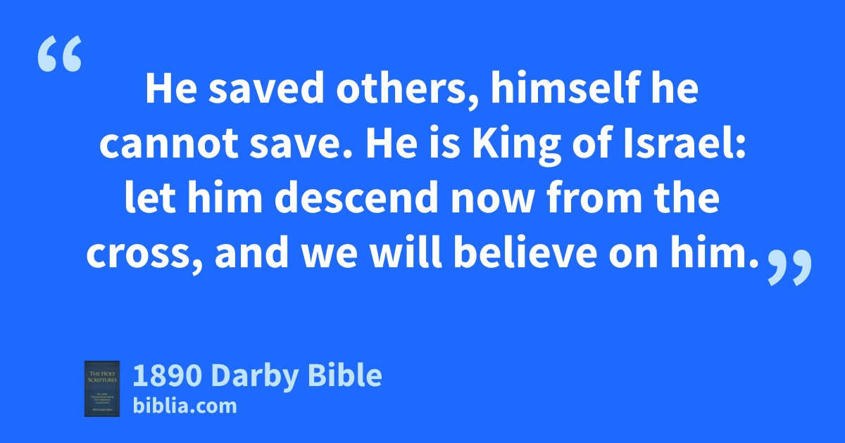 33 And having come to a place called Golgotha, which means Place of a skull, 34 they gave to him to drink vinegar mingled with gall; and having tasted it, he would not drink. 35 And having crucified him, they parted his clothes amongst themselves, casting lots. 36 And sitting down, they kept guard over him there. 37 And they set up over his head his accusation written: This is Jesus, the King of the Jews. 38 Then are crucified with him two robbers, one on the right hand and one on the left. 39 But the passers-by reviled him, shaking their heads 40 and saying, Thou that destroyest the temple and buildest it in three days, save thyself. If thou art Son of God, descend from the cross. 41 And in like manner the chief priests also, mocking, with the scribes and elders, said, 42 He saved others, himself he cannot save. He is King of Israel: let him descend now from the cross, and we will believe on him. 43 He trusted upon God; let him save him now if he will have him. For he said, I am Son of God. 44 And the robbers also who had been crucified with him cast the same reproaches on him. 45 Now from the sixth hour there was darkness over the whole land until the ninth hour; 46 but about the ninth hour Jesus cried out with a loud voice, saying, Eli, Eli, lama sabachthani? that is, My God, my God, why hast thou forsaken me? 47 And some of those who stood there, when they heard it, said, This man calls for Elias. 48 And immediately one of them running and getting a sponge, having filled it with vinegar and fixed it on a reed, gave him to drink. 49 But the rest said, Let be; let us see if Elias comes to save him.