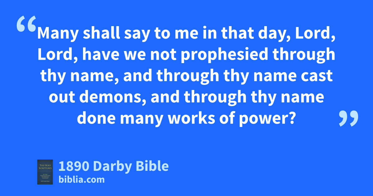 21 Not every one who says to me, Lord, Lord, shall enter into the kingdom of the heavens, but he that does the will of my Father who is in the heavens. 22 Many shall say to me in that day, Lord, Lord, have we not prophesied through thy name, and through thy name cast out demons, and through thy name done many works of power? 23 and then will I avow unto them, I never knew you. Depart from me, workers of lawlessness. 24 Whoever therefore hears these my words and does them, I will liken him to a prudent man, who built his house upon the rock; 25 and the rain came down, and the streams came, and the winds blew and fell upon that house, and it did not fall, for it had been founded upon the rock. 26 And every one who hears these my words and does not do them, he shall be likened to a foolish man, who built his house upon the sand; 27 and the rain came down, and the streams came, and the winds blew and beat upon that house, and it fell, and its fall was great. 28 And it came to pass, when Jesus had finished these words, the crowds were astonished at his doctrine, 29 for he taught them as having authority, and not as their scribes.