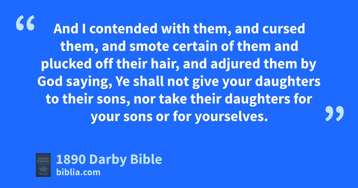23 In those days also I saw Jews that had married wives of Ashdod, of Ammon, and of Moab. 24 And their children spoke half in the language of Ashdod, and could not speak in the Jews’ language, but according to the language of each people. 25 And I contended with them, and cursed them, and smote certain of them and plucked off their hair, and adjured them by God saying, Ye shall not give your daughters to their sons, nor take their daughters for your sons or for yourselves. 26 Did not Solomon king of Israel sin by these things? Yet among the many nations was there no king like him, who was beloved of his God, and God made him king over all Israel; but even him did foreign wives cause to sin. 27 And should we hearken to you to do all this great evil, to act unfaithfully to our God by marrying foreign wives? 28 And one of the sons of Joiada, the son of Eliashib the high priest, was son-in-law to Sanballat the Horonite; and I chased him from me. 29 Remember them, my God, for they are polluters of the priesthood, and of the covenant of the priesthood and of the Levites! 30 And I purified them from all foreigners, and appointed the charges of the priests and the Levites, every one in his service; 31 and for the wood-offering, at times appointed, and for the first-fruits. Remember me, O my God, for good!