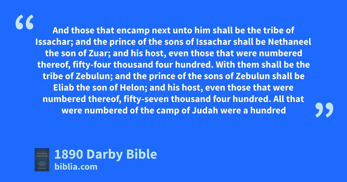 3 And for those encamping eastward toward the sun-rising there shall be the standard of the camp of Judah according to their hosts; and the prince of the sons of Judah shall be Nahshon the son of Amminadab; 4 and his host, even those that were numbered of them, were seventy-four thousand six hundred. 5 And those that encamp next unto him shall be the tribe of Issachar; and the prince of the sons of Issachar shall be Nethaneel the son of Zuar; 6 and his host, even those that were numbered thereof, fifty-four thousand four hundred. 7 With them shall be the tribe of Zebulun; and the prince of the sons of Zebulun shall be Eliab the son of Helon; 8 and his host, even those that were numbered thereof, fifty-seven thousand four hundred. 9 All that were numbered of the camp of Judah were a hundred and eighty-six thousand four hundred, according to their hosts. They shall set forth first. 10 The standard of the camp of Reuben shall be southward according to their hosts; and the prince of the sons of Reuben shall be Elizur the son of Shedeur; 11 and his host, even those that were numbered thereof, forty-six thousand five hundred. 12 And those that encamp by him shall be the tribe of Simeon; and the prince of the sons of Simeon shall be Shelumiel the son of Zurishaddai; 13 and his host, even those that were numbered of them, fifty-nine thousand three hundred. 14 And with them shall be the tribe of Gad; and the prince of the sons of Gad shall be Eliasaph the son of Reuel; 15 and his host, even those that were numbered of them, forty-five thousand six hundred and fifty. 16 All that were numbered of the camp of Reuben were a hundred and fifty-one thousand four hundred and fifty, according to their hosts. And they shall set forth second. 17 And the tent of meeting shall set forth, the camp of the Levites in the midst of the camps; as they encamp, so shall they set forth, every man in his place, according to their standards. 18 The standard of the camp of Ephraim according to their hosts shall be westward; and the prince of the sons of Ephraim shall be Elishama the son of Ammihud; 19 and his host, even those that were numbered of them, forty thousand five hundred. 20 And by him shall be the tribe of Manasseh; and the prince of the sons of Manasseh shall be Gamaliel the son of Pedahzur; 21 and his host, even those that were numbered of them, thirty-two thousand two hundred. 22 And with them shall be the tribe of Benjamin; and the prince of the sons of Benjamin shall be Abidan the son of Gideoni; 23 and his host, even those that were numbered of them, thirty-five thousand four hundred. 24 All that were numbered of the camp of Ephraim were a hundred and eight thousand one hundred, according to their hosts. And they shall set forth third. 25 The standard of the camp of Dan shall be northward according to their hosts; and the prince of the sons of Dan shall be Ahiezer the son of Ammishaddai; 26 and his host, even those that were numbered of them, sixty-two thousand seven hundred. 27 And those that encamp by him shall be the tribe of Asher; and the prince of the sons of Asher shall be Pagiel the son of Ocran; 28 and his host, even those that were numbered of them, forty-one thousand five hundred. 29 And with them shall be the tribe of Naphtali; and the prince of the sons of Naphtali shall be Ahira the son of Enan; 30 and his host, even those that were numbered of them, fifty-three thousand four hundred. 31 All that were numbered of the camp of Dan were a hundred and fifty-seven thousand six hundred. They shall set forth last according to their standards. 32 These are those that were numbered of the children of Israel, according to their fathers’ houses: all those that were numbered of the camps, according to their hosts, were six hundred and three thousand five hundred and fifty. 33 But the Levites were not numbered among the children of Israel; as Jehovah had commanded Moses. 34 And the children of Israel did according to all that Jehovah had commanded Moses: so they encamped according to their standards, and so they journeyed, every one according to their families, according to their fathers’ houses.