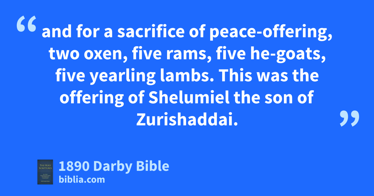 10 And the princes presented the dedication-gift of the altar on the day that it was anointed; and the princes presented their offering before the altar. 11 And Jehovah said to Moses, They shall present their offering for the dedication of the altar, each prince on his day. 12 And he that presented his offering the first day was Nahshon the son of Amminadab, of the tribe of Judah. 13 And his offering was one silver dish of the weight of a hundred and thirty shekels, one silver bowl, of seventy shekels, according to the shekel of the sanctuary, both of them full of fine flour mingled with oil for an oblation; 14 one cup of ten shekels of gold, full of incense; 15 one young bullock, one ram, one yearling lamb, for a burnt-offering; 16 one buck of the goats for a sin-offering; 17 and for a sacrifice of peace-offering, two oxen, five rams, five he-goats, five yearling lambs. This was the offering of Nahshon the son of Amminadab. 18 On the second day offered Nethaneel the son of Zuar, prince of Issachar; 19 he presented his offering; one silver dish of the weight of a hundred and thirty shekels, one silver bowl of seventy shekels, according to the shekel of the sanctuary, both of them full of fine flour, mingled with oil for an oblation; 20 one cup of ten shekels of gold, full of incense; 21 one young bullock, one ram, one yearling lamb, for a burnt-offering; 22 one buck of the goats for a sin-offering; 23 and for a sacrifice of peace-offering, two oxen, five rams, five he-goats, five yearling lambs. This was the offering of Nethaneel the son of Zuar. 24 On the third day, the prince of the children of Zebulun, Eliab the son of Helon: 25 his offering was one silver dish of the weight of a hundred and thirty shekels, one silver bowl of seventy shekels, according to the shekel of the sanctuary, both of them full of fine flour mingled with oil for an oblation; 26 one cup of ten shekels of gold, full of incense; 27 one young bullock, one ram, one yearling lamb, for a burnt-offering; 28 one buck of the goats for a sin-offering; 29 and for a sacrifice of peace-offering, two oxen, five rams, five he-goats, five yearling lambs. This was the offering of Eliab the son of Helon. 30 On the fourth day, the prince of the children of Reuben, Elizur the son of Shedeur. 31 His offering was one silver dish of the weight of a hundred and thirty shekels, one silver bowl of seventy shekels, according to the shekel of the sanctuary, both of them full of fine flour mingled with oil for an oblation; 32 one cup of ten shekels of gold, full of incense; 33 one young bullock, one ram, one yearling lamb, for a burnt-offering; 34 one buck of the goats for a sin-offering; 35 and for a sacrifice of peace-offering, two oxen, five rams, five he-goats, five yearling lambs. This was the offering of Elizur, the son of Shedeur. 36 On the fifth day, the prince of the children of Simeon, Shelumiel the son of Zurishaddai. 37 His offering was one silver dish of the weight of a hundred and thirty shekels, one silver bowl of seventy shekels, according to the shekel of the sanctuary, both of them full of fine flour mingled with oil for an oblation; 38 one cup of ten shekels of gold, full of incense; 39 one young bullock, one ram, one yearling lamb, for a burnt-offering; 40 one buck of the goats for a sin-offering; 41 and for a sacrifice of peace-offering, two oxen, five rams, five he-goats, five yearling lambs. This was the offering of Shelumiel the son of Zurishaddai. 42 On the sixth day, the prince of the children of Gad, Eliasaph the son of Deuel. 43 His offering was one silver dish of the weight of a hundred and thirty shekels, one silver bowl of seventy shekels, according to the shekel of the sanctuary, both of them full of fine flour mingled with oil for an oblation; 44 one cup of ten shekels of gold, full of incense; 45 one young bullock, one ram, one yearling lamb, for a burnt-offering; 46 one buck of the goats for a sin-offering; 47 and for a sacrifice of peace-offering, two oxen, five rams, five he-goats, five yearling lambs. This was the offering of Eliasaph the son of Deuel. 48 On the seventh day, the prince of the children of Ephraim, Elishama the son of Ammihud. 49 His offering was one silver dish of the weight of a hundred and thirty shekels, one silver bowl of seventy shekels, according to the shekel of the sanctuary, both of them full of fine flour mingled with oil for an oblation; 50 one cup of ten shekels of gold, full of incense; 51 one young bullock, one ram, one yearling lamb, for a burnt-offering; 52 one buck of the goats for a sin-offering; 53 and for a sacrifice of peace-offering, two oxen, five rams, five he-goats, five yearling lambs. This was the offering of Elishama the son of Ammihud. 54 On the eighth day, the prince of the children of Manasseh, Gamaliel the son of Pedahzur. 55 His offering was one silver dish of the weight of a hundred and thirty shekels, one silver bowl of seventy shekels, according to the shekel of the sanctuary, both of them full of fine flour mingled with oil for an oblation; 56 one cup of ten shekels of gold, full of incense; 57 one young bullock, one ram, one yearling lamb, for a burnt-offering; 58 one buck of the goats for a sin-offering; 59 and for a sacrifice of peace-offering, two oxen, five rams, five he-goats, five yearling lambs. This was the offering of Gamaliel the son of Pedahzur. 60 On the ninth day, the prince of the children of Benjamin, Abidan the son of Gideoni. 61 His offering was one silver dish of the weight of a hundred and thirty shekels, one silver bowl of seventy shekels, according to the shekel of the sanctuary, both of them full of fine flour mingled with oil for an oblation; 62 one cup of ten shekels of gold, full of incense; 63 one young bullock, one ram, one yearling lamb, for a burnt-offering; 64 one buck of the goats for a sin-offering; 65 and for a sacrifice of peace-offering, two oxen, five rams, five he-goats, five yearling lambs. This was the offering 