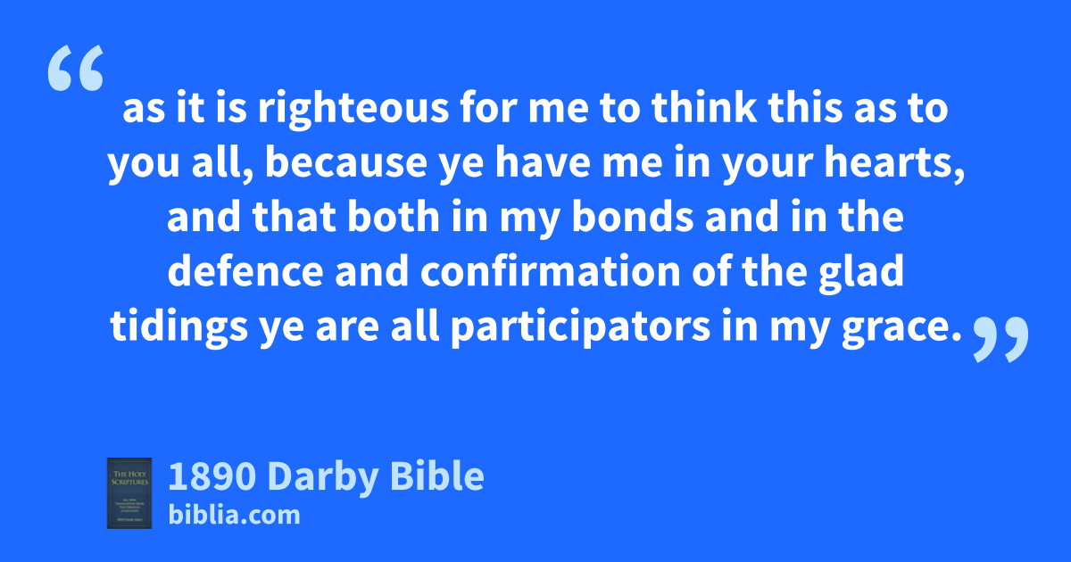 7 as it is righteous for me to think this as to you all, because ye have me in your hearts, and that both in my bonds and in the defence and confirmation of the glad tidings ye are all participators in my grace. 8 For God is my witness how I long after you all in the bowels of Christ Jesus.