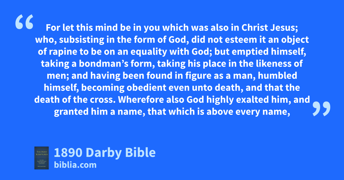 1 If then there be any comfort in Christ, if any consolation of love, if any fellowship of the Spirit, if any bowels and compassions, 2 fulfil my joy, that ye may think the same thing, having the same love, joined in soul, thinking one thing; 3 let nothing be in the spirit of strife or vain glory, but, in lowliness of mind, each esteeming the other as more excellent than themselves; 4 regarding not each his own qualities, but each those of others also. 5 For let this mind be in you which was also in Christ Jesus; 6 who, subsisting in the form of God, did not esteem it an object of rapine to be on an equality with God; 7 but emptied himself, taking a bondman’s form, taking his place in the likeness of men; 8 and having been found in figure as a man, humbled himself, becoming obedient even unto death, and that the death of the cross. 9 Wherefore also God highly exalted him, and granted him a name, that which is above every name, 10 that at the name of Jesus every knee should bow, of heavenly and earthly and infernal beings, 11 and every tongue confess that Jesus Christ is Lord to God the Father’s glory.