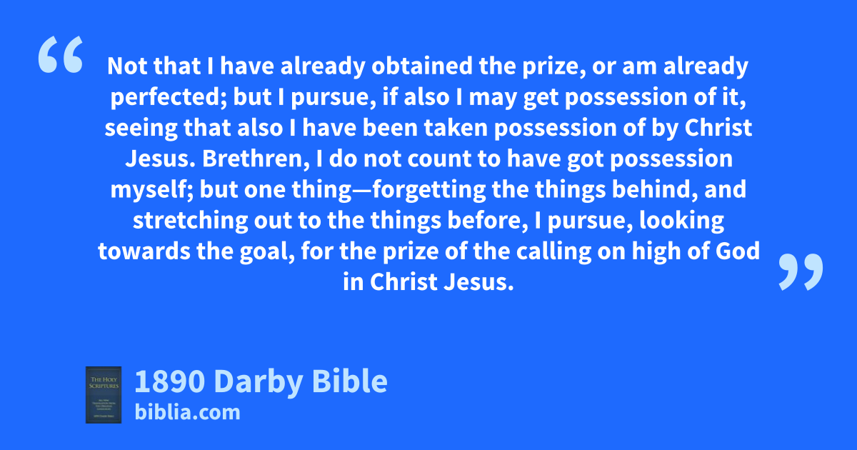 9 and that I may be found in him, not having my righteousness, which would be on the principle of law, but that which is by faith of Christ, the righteousness which is of God through faith, 10 to know him, and the power of his resurrection, and the fellowship of his sufferings, being conformed to his death, 11 if any way I arrive at the resurrection from among the dead. 12 Not that I have already obtained the prize, or am already perfected; but I pursue, if also I may get possession of it, seeing that also I have been taken possession of by Christ Jesus. 13 Brethren, I do not count to have got possession myself; but one thing—forgetting the things behind, and stretching out to the things before, 14 I pursue, looking towards the goal, for the prize of the calling on high of God in Christ Jesus.