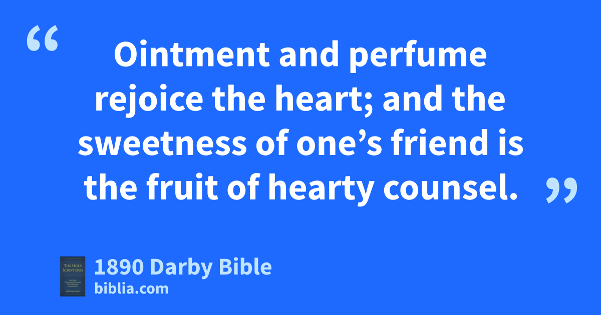 9 Ointment and perfume rejoice the heart; and the sweetness of one’s friend is the fruit of hearty counsel. 10 Thine own friend, and thy father’s friend, forsake not; and go not into thy brother’s house in the day of thy calamity: better is a neighbour that is near than a brother far off.