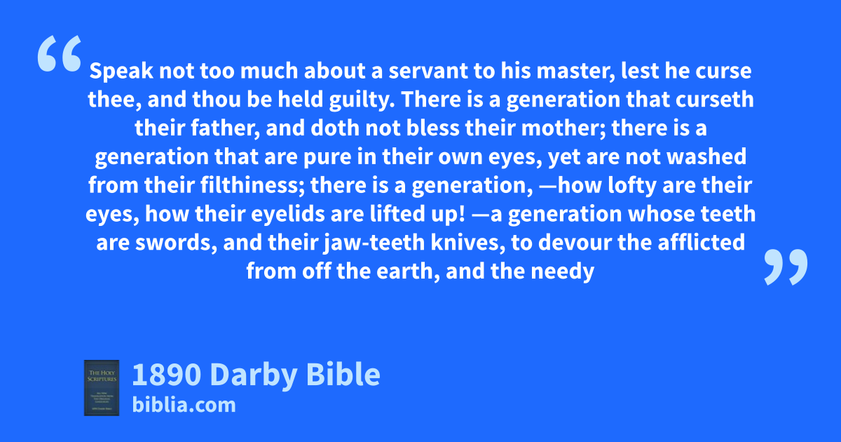 10 Speak not too much about a servant to his master, lest he curse thee, and thou be held guilty. 11 There is a generation that curseth their father, and doth not bless their mother; 12 there is a generation that are pure in their own eyes, yet are not washed from their filthiness; 13 there is a generation, —how lofty are their eyes, how their eyelids are lifted up! 14 —a generation whose teeth are swords, and their jaw-teeth knives, to devour the afflicted from off the earth, and the needy from among men.