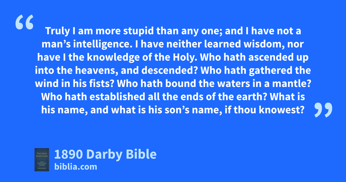 1 The words of Agur the son of Jakeh; the prophecy uttered by the man unto Ithiel, even unto Ithiel and Ucal: 2 Truly I am more stupid than any one; and I have not a man’s intelligence. 3 I have neither learned wisdom, nor have I the knowledge of the Holy. 4 Who hath ascended up into the heavens, and descended? Who hath gathered the wind in his fists? Who hath bound the waters in a mantle? Who hath established all the ends of the earth? What is his name, and what is his son’s name, if thou knowest? 5 Every word of †God is pure: he is a shield unto them that put their trust in him. 6 Add thou not unto his words, lest he reprove thee, and thou be found a liar.