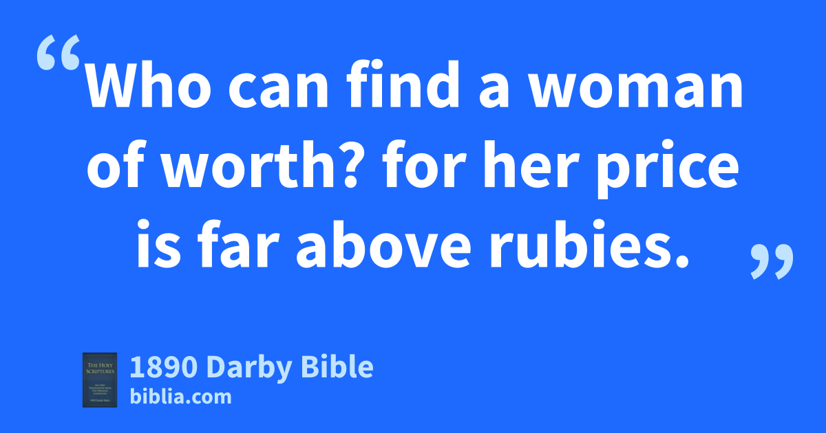 10 Who can find a woman of worth? for her price is far above rubies. 11 The heart of her husband confideth in her, and he shall have no lack of spoil. 12 She doeth him good, and not evil, all the days of her life. 13 She seeketh wool and flax, and worketh willingly with her hands. 14 She is like the merchants’ ships: she bringeth her food from afar; 15 And she riseth while it is yet night, and giveth meat to her household, and the day’s work to her maidens. 16 She considereth a field, and acquireth it; of the fruit of her hands she planteth a vineyard. 17 She girdeth her loins with strength, and maketh strong her arms. 18 She perceiveth that her earning is good; her lamp goeth not out by night. 19 She putteth her hands to the distaff, and her hands hold the spindle. 20 She stretcheth out her hand to the afflicted, and she reacheth forth her hands to the needy. 21 She is not afraid of the snow for her household; for all her household are clothed with scarlet. 22 She maketh herself coverlets; her clothing is byssus and purple. 23 Her husband is known in the gates, when he sitteth among the elders of the land. 24 She maketh body linen and selleth it, and delivereth girdles unto the merchant. 25 Strength and dignity are her clothing, and she laugheth at the coming day. 26 She openeth her mouth with wisdom; and upon her tongue is the law of kindness. 27 She surveyeth the ways of her household, and eateth not the bread of idleness. 28 Her children rise up and call her blessed; her husband also, and he praiseth her: 29 Many daughters have done worthily, but thou excellest them all. 30 Gracefulness is deceitful and beauty is vain; a woman that feareth Jehovah, she shall be praised. 31 Give her of the fruit of her hands, and let her own works praise her in the gates.