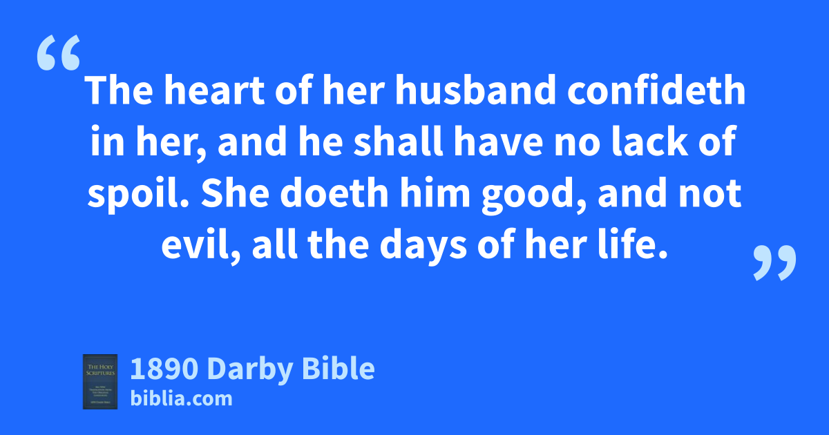 10 Who can find a woman of worth? for her price is far above rubies. 11 The heart of her husband confideth in her, and he shall have no lack of spoil. 12 She doeth him good, and not evil, all the days of her life. 13 She seeketh wool and flax, and worketh willingly with her hands. 14 She is like the merchants’ ships: she bringeth her food from afar; 15 And she riseth while it is yet night, and giveth meat to her household, and the day’s work to her maidens. 16 She considereth a field, and acquireth it; of the fruit of her hands she planteth a vineyard. 17 She girdeth her loins with strength, and maketh strong her arms. 18 She perceiveth that her earning is good; her lamp goeth not out by night. 19 She putteth her hands to the distaff, and her hands hold the spindle. 20 She stretcheth out her hand to the afflicted, and she reacheth forth her hands to the needy. 21 She is not afraid of the snow for her household; for all her household are clothed with scarlet. 22 She maketh herself coverlets; her clothing is byssus and purple. 23 Her husband is known in the gates, when he sitteth among the elders of the land. 24 She maketh body linen and selleth it, and delivereth girdles unto the merchant. 25 Strength and dignity are her clothing, and she laugheth at the coming day. 26 She openeth her mouth with wisdom; and upon her tongue is the law of kindness. 27 She surveyeth the ways of her household, and eateth not the bread of idleness. 28 Her children rise up and call her blessed; her husband also, and he praiseth her: 29 Many daughters have done worthily, but thou excellest them all. 30 Gracefulness is deceitful and beauty is vain; a woman that feareth Jehovah, she shall be praised. 31 Give her of the fruit of her hands, and let her own works praise her in the gates.