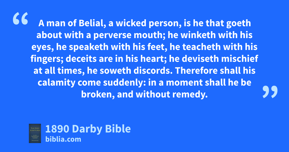 12 A man of Belial, a wicked person, is he that goeth about with a perverse mouth; 13 he winketh with his eyes, he speaketh with his feet, he teacheth with his fingers; 14 deceits are in his heart; he deviseth mischief at all times, he soweth discords. 15 Therefore shall his calamity come suddenly: in a moment shall he be broken, and without remedy. 16 These six things doth Jehovah hate, yea, seven are an abomination unto him: 17 haughty eyes, a lying tongue, and hands that shed innocent blood; 18 a heart that deviseth wicked imaginations; feet that are swift in running to mischief; 19 a false witness that uttereth lies, and he that soweth discords among brethren.