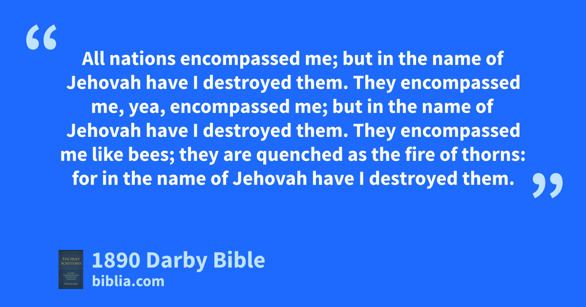 1 Give ye thanks unto Jehovah; for he is good; for his loving-kindness endureth for ever. 2 Oh let Israel say, that his loving-kindness endureth for ever. 3 Oh let the house of Aaron say, that his loving-kindness endureth for ever. 4 Oh let them that fear Jehovah say, that his loving-kindness endureth for ever. 5 I called upon Jah in distress; Jah answered me and set me in a large place. 6 Jehovah is for me, I will not fear; what can man do unto me? 7 Jehovah is for me among them that help me; and I shall see my desire upon them that hate me. 8 It is better to trust in Jehovah than to put confidence in man; 9 It is better to trust in Jehovah than to put confidence in nobles. 10 All nations encompassed me; but in the name of Jehovah have I destroyed them. 11 They encompassed me, yea, encompassed me; but in the name of Jehovah have I destroyed them. 12 They encompassed me like bees; they are quenched as the fire of thorns: for in the name of Jehovah have I destroyed them. 13 Thou hast thrust hard at me that I might fall; but Jehovah helped me. 14 My strength and song is Jah, and he is become my salvation. 15 The voice of triumph and salvation is in the tents of the righteous: the right hand of Jehovah doeth valiantly; 16 The right hand of Jehovah is exalted, the right hand of Jehovah doeth valiantly. 17 I shall not die, but live, and declare the works of Jah. 18 Jah hath chastened me sore; but he hath not given me over unto death.