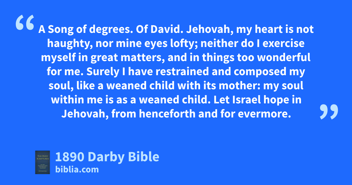 1 Jehovah, my heart is not haughty, nor mine eyes lofty; neither do I exercise myself in great matters, and in things too wonderful for me. 2 Surely I have restrained and composed my soul, like a weaned child with its mother: my soul within me is as a weaned child. 3 Let Israel hope in Jehovah, from henceforth and for evermore.