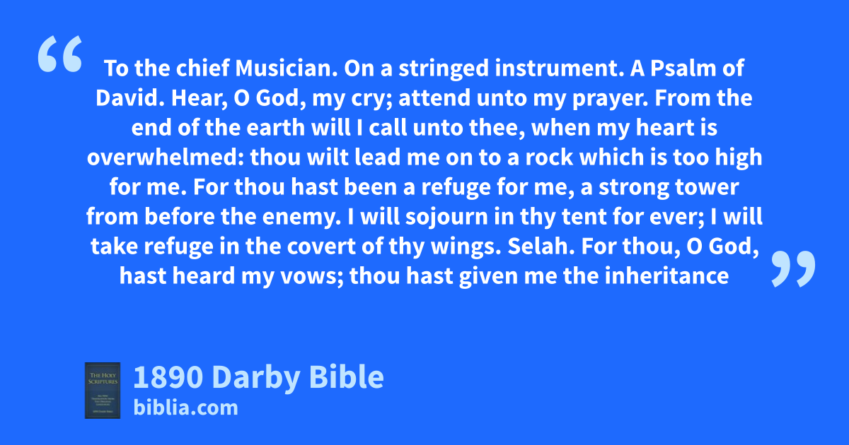 1 Hear, O God, my cry; attend unto my prayer. 2 From the end of the earth will I call unto thee, when my heart is overwhelmed: thou wilt lead me on to a rock which is too high for me. 3 For thou hast been a refuge for me, a strong tower from before the enemy. 4 I will sojourn in thy tent for ever; I will take refuge in the covert of thy wings. Selah.