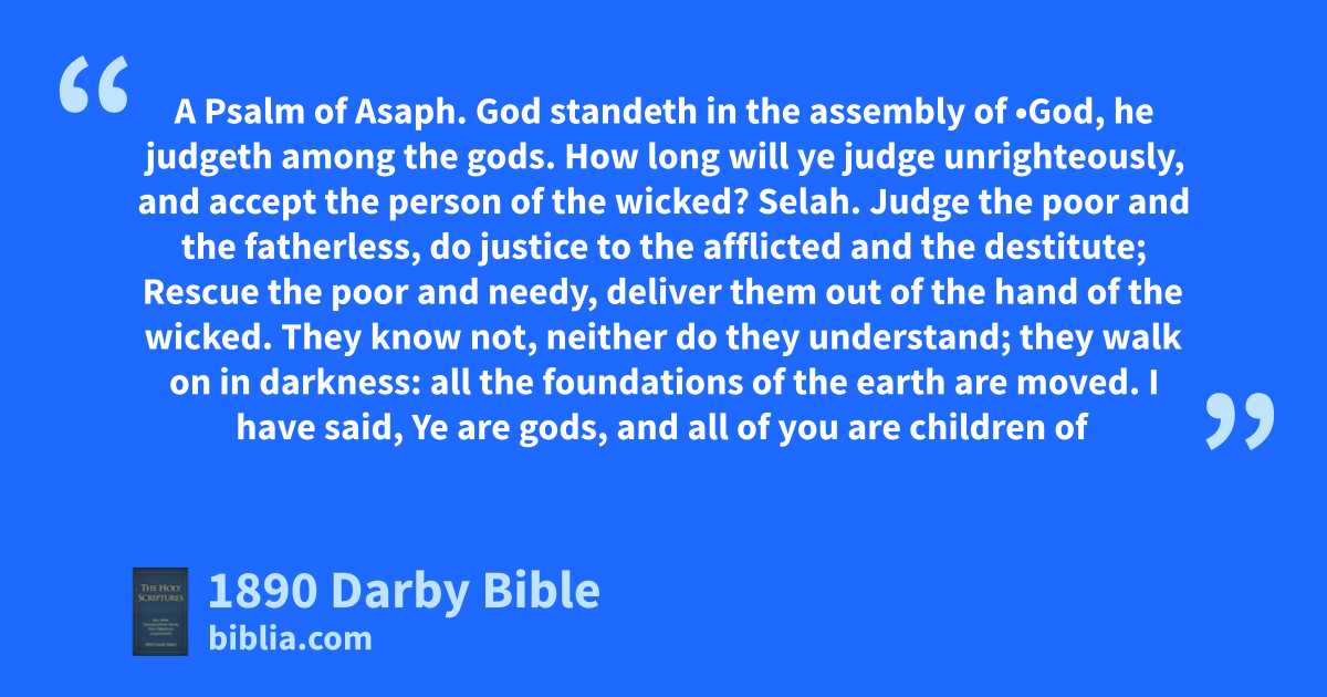 1 God standeth in the assembly of •God, he judgeth among the gods. 2 How long will ye judge unrighteously, and accept the person of the wicked? Selah. 3 Judge the poor and the fatherless, do justice to the afflicted and the destitute; 4 Rescue the poor and needy, deliver them out of the hand of the wicked. 5 They know not, neither do they understand; they walk on in darkness: all the foundations of the earth are moved.