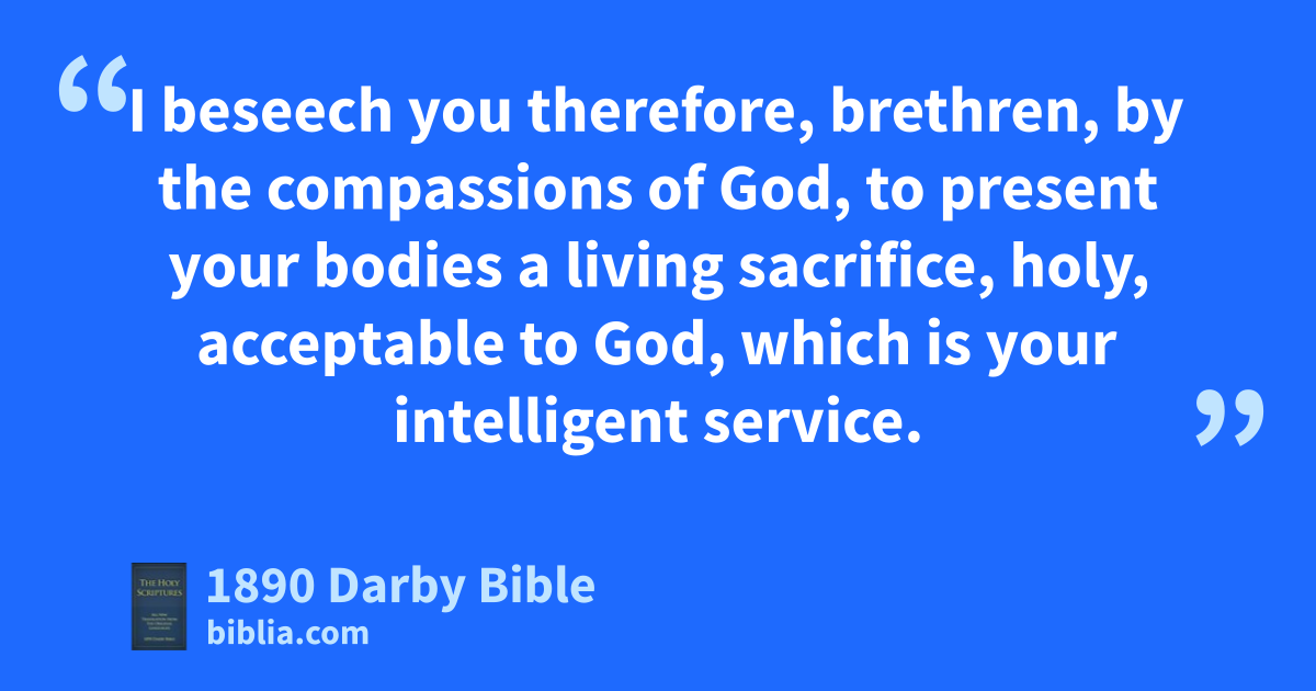 1 I beseech you therefore, brethren, by the compassions of God, to present your bodies a living sacrifice, holy, acceptable to God, which is your intelligent service. 2 And be not conformed to this world, but be transformed by the renewing of your mind, that ye may prove what is the good and acceptable and perfect will of God. 3 For I say, through the grace which has been given to me, to every one that is among you, not to have high thoughts above what he should think; but to think so as to be wise, as God has dealt to each a measure of faith. 4 For, as in one body we have many members, but all the members have not the same office; 5 thus we, being many, are one body in Christ, and each one members one of the other. 6 But having different gifts, according to the grace which has been given to us, whether it be prophecy, let us prophesy according to the proportion of faith; 7 or service, let us occupy ourselves in service; or he that teaches, in teaching; 8 or he that exhorts, in exhortation; he that gives, in simplicity; he that leads, with diligence; he that shews mercy, with cheerfulness. 9 Let love be unfeigned; abhorring evil; cleaving to good: 10 as to brotherly love, kindly affectioned towards one another: as to honour, each taking the lead in paying it to the other: 11 as to diligent zealousness, not slothful; in spirit fervent; serving the Lord. 12 As regards hope, rejoicing: as regards tribulation, enduring: as regards prayer, persevering: 13 distributing to the necessities of the saints; given to hospitality. 14 Bless them that persecute you; bless, and curse not. 15 Rejoice with those that rejoice, weep with those that weep. 16 Have the same respect one for another, not minding high things, but going along with the lowly: be not wise in your own eyes: 17 recompensing to no one evil for evil: providing things honest before all men: 18 if possible, as far as depends on you, living in peace with all men; 19 not avenging yourselves, beloved, but give place to wrath; for it is written, Vengeance belongs to me, I will recompense, saith the Lord. 20 If therefore thine enemy should hunger, feed him; if he should thirst, give him drink; for, so doing, thou shalt heap coals of fire upon his head. 21 Be not overcome by evil, but overcome evil with good.