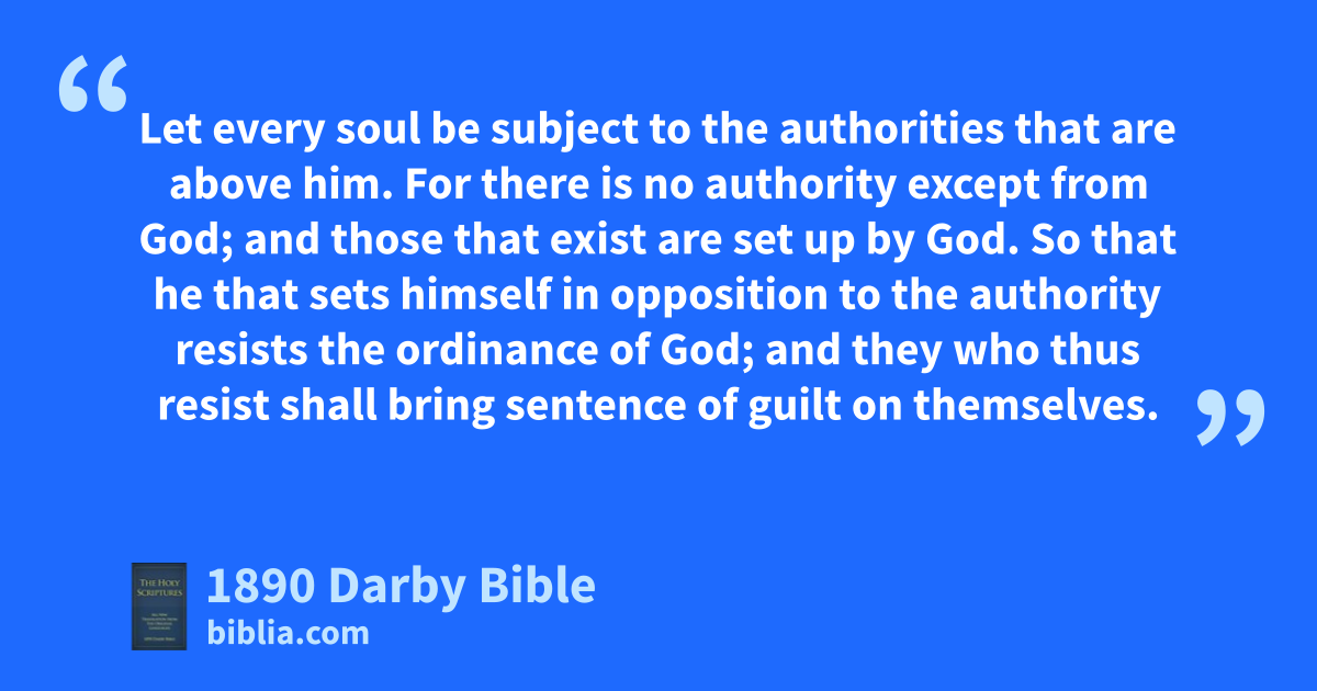 1 Let every soul be subject to the authorities that are above him. For there is no authority except from God; and those that exist are set up by God. 2 So that he that sets himself in opposition to the authority resists the ordinance of God; and they who thus resist shall bring sentence of guilt on themselves. 3 For rulers are not a terror to a good work, but to an evil one. Dost thou desire then not to be afraid of the authority? practise what is good, and thou shalt have praise from it; 4 for it is God’s minister to thee for good. But if thou practisest evil, fear; for it bears not the sword in vain; for it is God’s minister, an avenger for wrath to him that does evil. 5 Wherefore it is necessary to be subject, not only on account of wrath, but also on account of conscience. 6 For on this account ye pay tribute also; for they are God’s officers, attending continually on this very thing.
