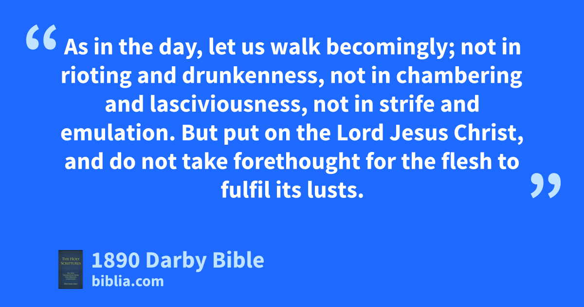 11 This also, knowing the time, that it is already time that we should be aroused out of sleep; for now is our salvation nearer than when we believed. 12 The night is far spent, and the day is near; let us cast away therefore the works of darkness, and let us put on the armour of light. 13 As in the day, let us walk becomingly; not in rioting and drunkenness, not in chambering and lasciviousness, not in strife and emulation. 14 But put on the Lord Jesus Christ, and do not take forethought for the flesh to fulfil its lusts.