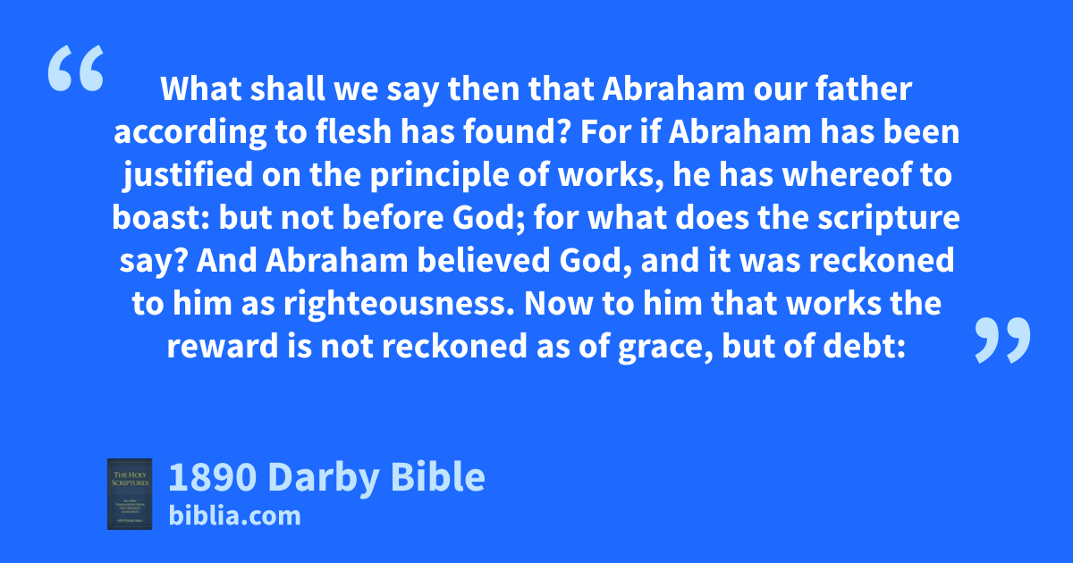 1 What shall we say then that Abraham our father according to flesh has found? 2 For if Abraham has been justified on the principle of works, he has whereof to boast: but not before God; 3 for what does the scripture say? And Abraham believed God, and it was reckoned to him as righteousness. 4 Now to him that works the reward is not reckoned as of grace, but of debt: 5 but to him who does not work, but believes on him who justifies the ungodly, his faith is reckoned as righteousness. 6 Even as David also declares the blessedness of the man to whom God reckons righteousness without works: 7 Blessed they whose lawlessnesses have been forgiven, and whose sins have been covered: 8 blessed the man to whom the Lord shall not at all reckon sin.