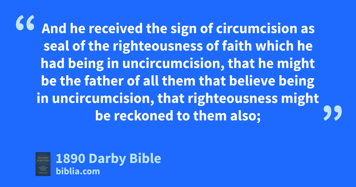 9 Does this blessedness then rest on the circumcision, or also on the uncircumcision? For we say that faith has been reckoned to Abraham as righteousness. 10 How then has it been reckoned? when he was in circumcision, or in uncircumcision? Not in circumcision, but in uncircumcision. 11 And he received the sign of circumcision as seal of the righteousness of faith which he had being in uncircumcision, that he might be the father of all them that believe being in uncircumcision, that righteousness might be reckoned to them also; 12 and father of circumcision, not only to those who are of the circumcision, but to those also who walk in the steps of the faith, during uncircumcision, of our father Abraham. 13 For it was not by law that the promise was to Abraham, or to his seed, that he should be heir of the world, but by righteousness of faith. 14 For if they which are of law be heirs, faith is made vain, and the promise made of no effect. 15 For law works wrath; but where no law is neither is there transgression. 16 Therefore it is on the principle of faith, that it might be according to grace, in order to the promise being sure to all the seed, not to that only which is of the law, but to that also which is of Abraham’s faith, who is father of us all,