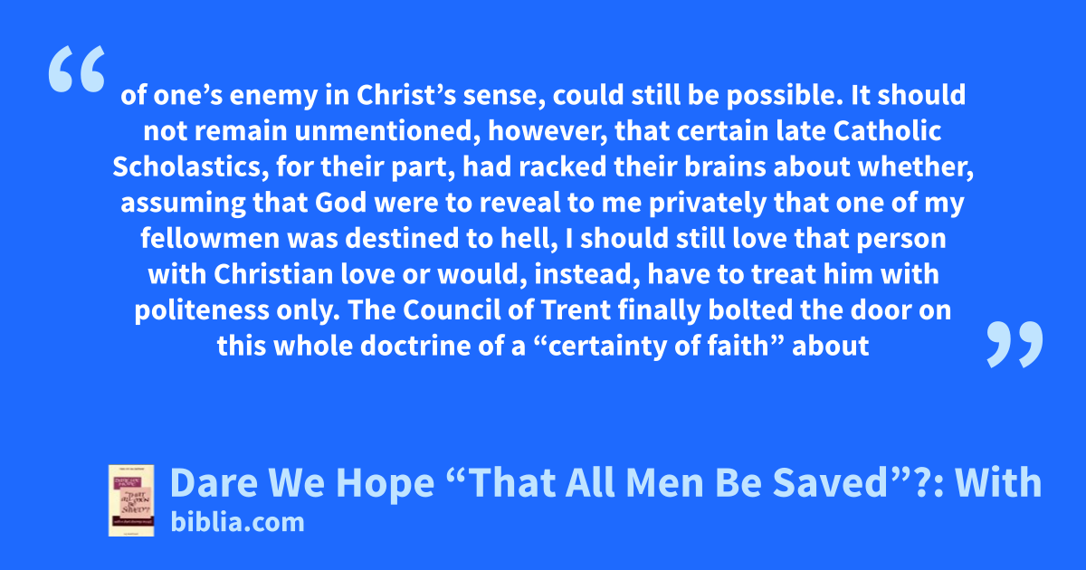 of one’s enemy in Christ’s sense, could still be possible. It should not remain unmentioned, however, that certain late Catholic Scholastics, for their part, had racked their brains about whether, assuming that God were to reveal to me privately that one of my fellowmen was destined to hell, I should still love that person with Christian love or would, instead, have to treat him with politeness only. The Council of Trent finally bolted the door on this whole doctrine of a “certainty of faith” about