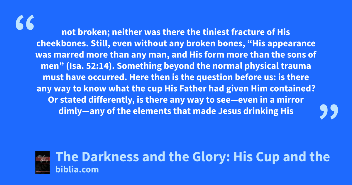 not broken; neither was there the tiniest fracture of His cheekbones. Still, even without any broken bones, “His appearance was marred more than any man, and His form more than the sons of men” (Isa. 52:14). Something beyond the normal physical trauma must have occurred. Here then is the question before us: is there any way to know what the cup His Father had given Him contained? Or stated differently, is there any way to see—even in a mirror dimly—any of the elements that made Jesus drinking His