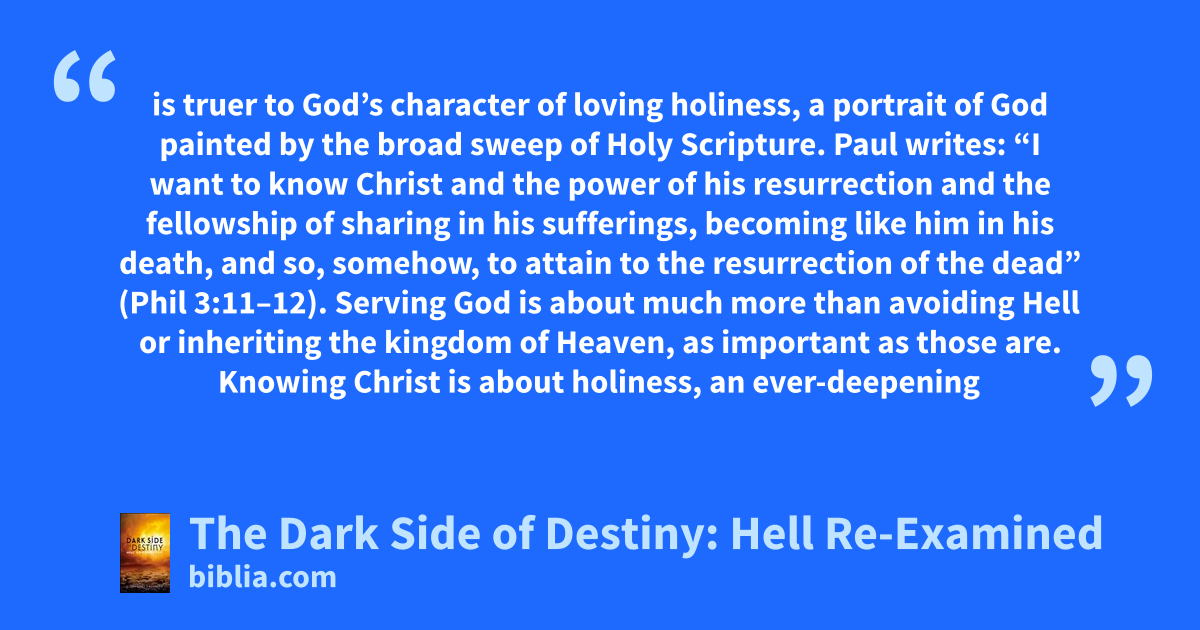 is truer to God’s character of loving holiness, a portrait of God painted by the broad sweep of Holy Scripture. Paul writes: “I want to know Christ and the power of his resurrection and the fellowship of sharing in his sufferings, becoming like him in his death, and so, somehow, to attain to the resurrection of the dead” (Phil 3:11–12). Serving God is about much more than avoiding Hell or inheriting the kingdom of Heaven, as important as those are. Knowing Christ is about holiness, an ever-deepening