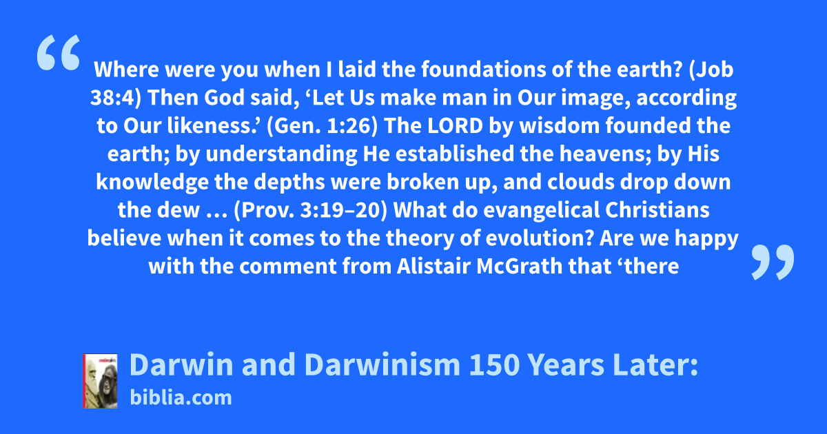 Where were you when I laid the foundations of the earth? (Job 38:4) Then God said, ‘Let Us make man in Our image, according to Our likeness.’ (Gen. 1:26) The LORD by wisdom founded the earth; by understanding He established the heavens; by His knowledge the depths were broken up, and clouds drop down the dew … (Prov. 3:19–20) What do evangelical Christians believe when it comes to the theory of evolution? Are we happy with the comment from Alistair McGrath that ‘there