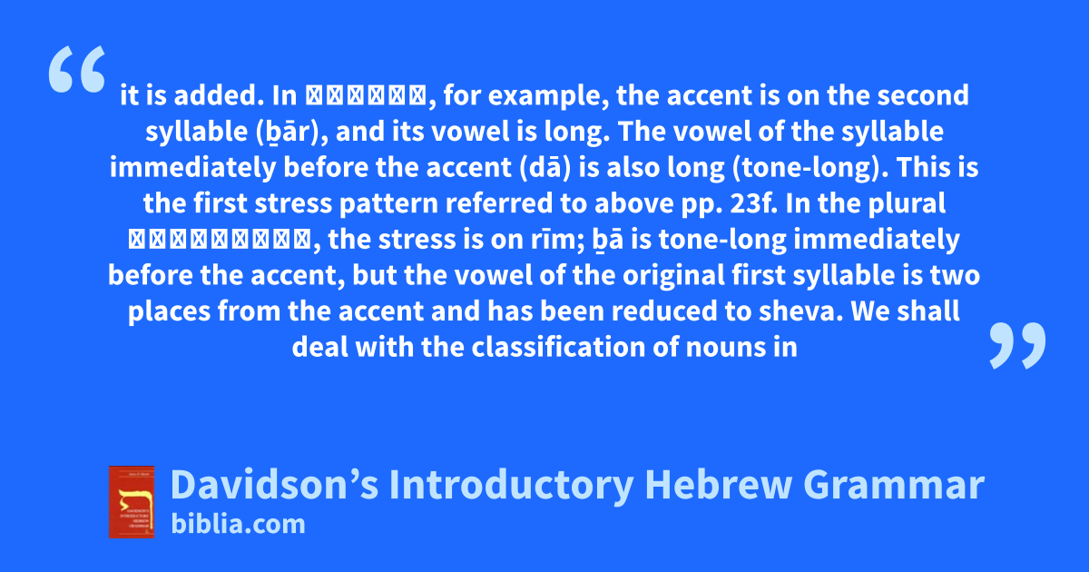it is added. In דָּבָר, for example, the accent is on the second syllable (ḇār), and its vowel is long. The vowel of the syllable immediately before the accent (dā) is also long (tone-long). This is the first stress pattern referred to above pp. 23f. In the plural דְּבָרִים, the stress is on rīm; ḇā is tone-long immediately before the accent, but the vowel of the original first syllable is two places from the accent and has been reduced to sheva. We shall deal with the classification of nouns in