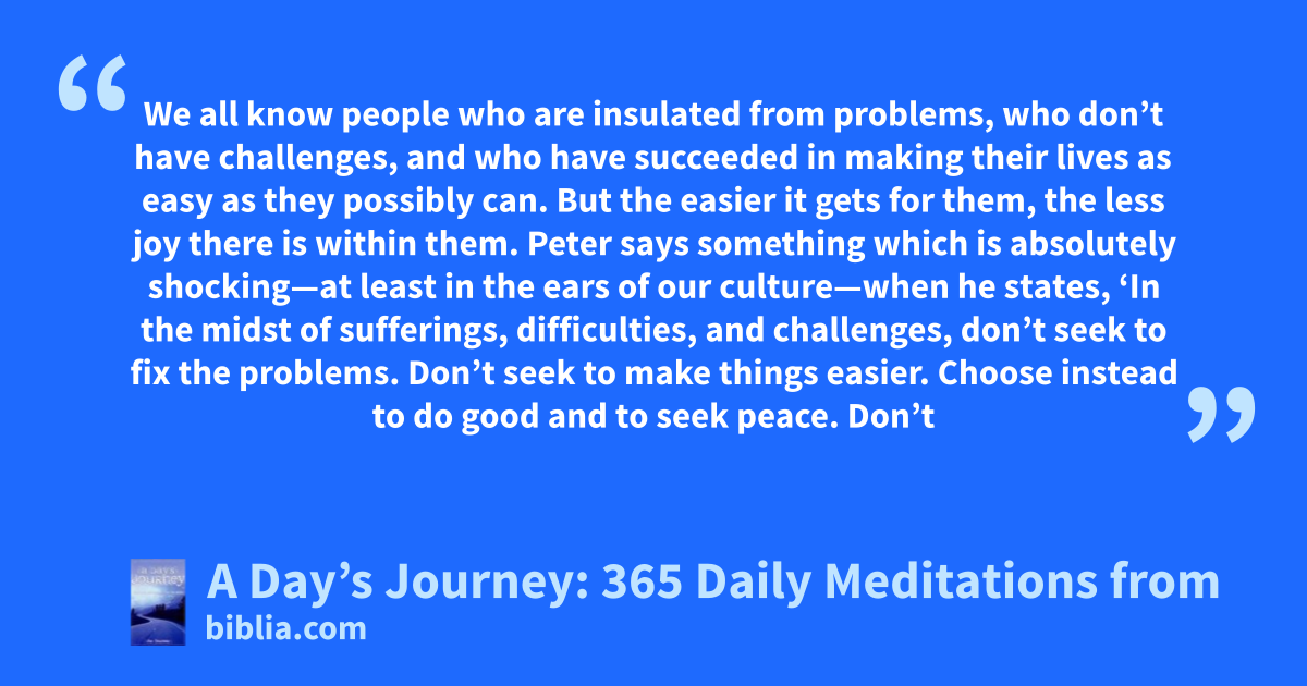 We all know people who are insulated from problems, who don’t have challenges, and who have succeeded in making their lives as easy as they possibly can. But the easier it gets for them, the less joy there is within them. Peter says something which is absolutely shocking—at least in the ears of our culture—when he states, ‘In the midst of sufferings, difficulties, and challenges, don’t seek to fix the problems. Don’t seek to make things easier. Choose instead to do good and to seek peace. Don’t