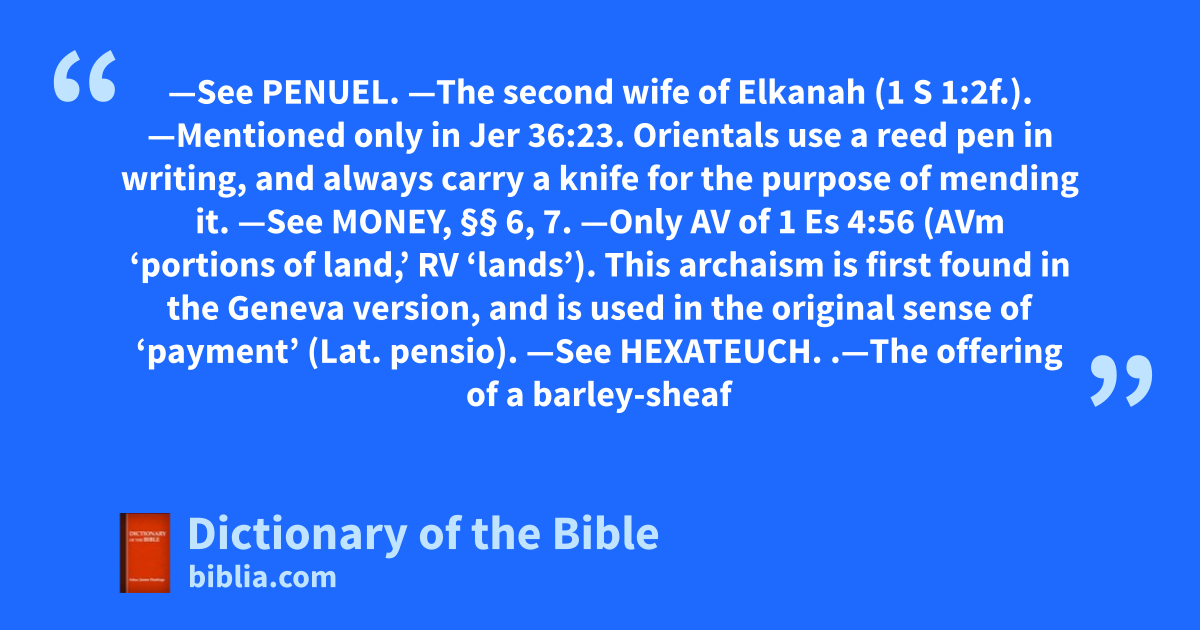 —See PENUEL. —The second wife of Elkanah (1 S 1:2f.). —Mentioned only in Jer 36:23. Orientals use a reed pen in writing, and always carry a knife for the purpose of mending it. —See MONEY, §§ 6, 7. —Only AV of 1 Es 4:56 (AVm ‘portions of land,’ RV ‘lands’). This archaism is first found in the Geneva version, and is used in the original sense of ‘payment’ (Lat. pensio). —See HEXATEUCH. .—The offering of a barley-sheaf