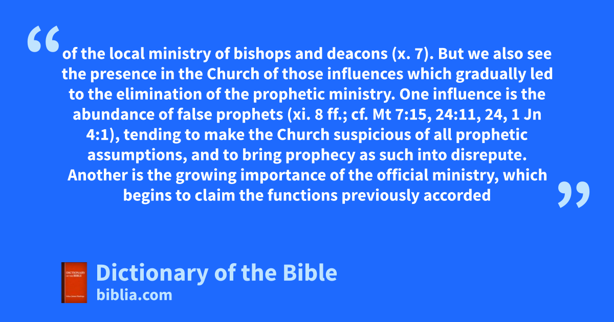 of the local ministry of bishops and deacons (x. 7). But we also see the presence in the Church of those influences which gradually led to the elimination of the prophetic ministry. One influence is the abundance of false prophets (xi. 8 ff.; cf. Mt 7:15, 24:11, 24, 1 Jn 4:1), tending to make the Church suspicious of all prophetic assumptions, and to bring prophecy as such into disrepute. Another is the growing importance of the official ministry, which begins to claim the functions previously accorded
